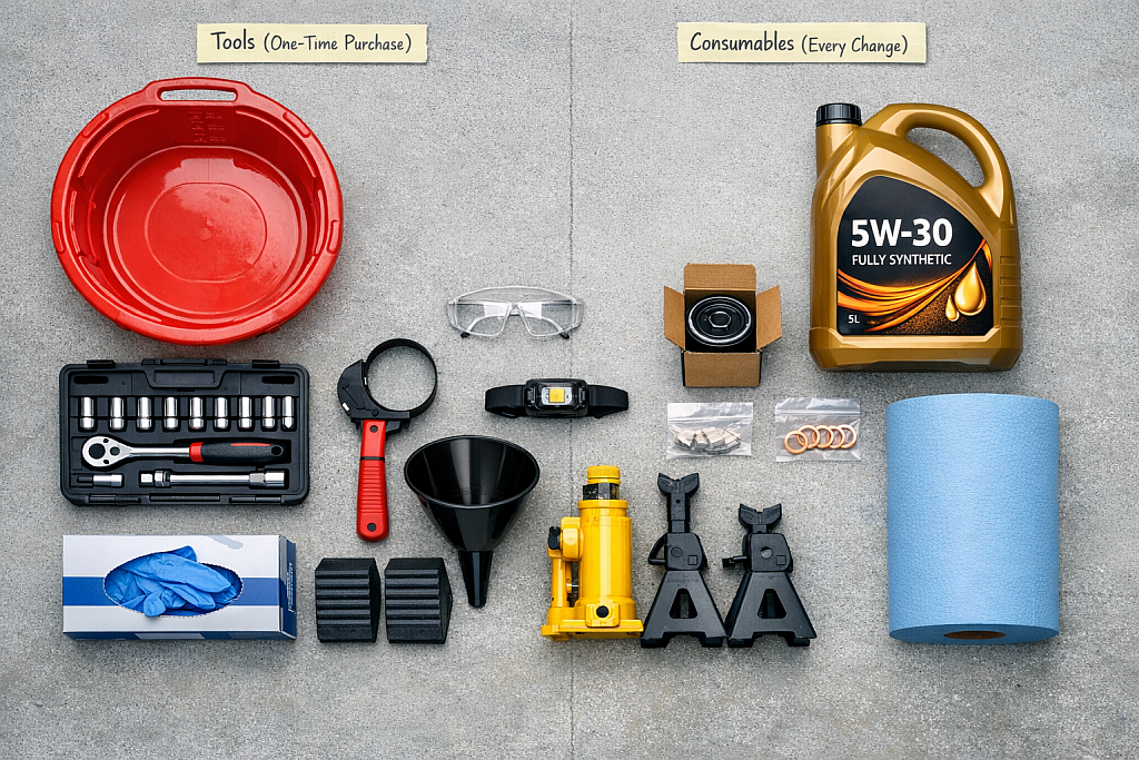 - Latex or nitrile gloves (£5 for box) – keeps hands clean Total tool investment: £81-137 (pays for itself after 2-3 oil changes)