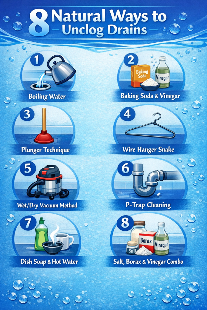 You don’t need harsh chemicals to unclog your drains effectively. From simple boiling water to the trusty baking soda and vinegar volcano, these 8 natural methods can handle virtually any household drain clog safely and affordably. Start with the easiest solutions first, and work your way up to more involved methods only if needed.